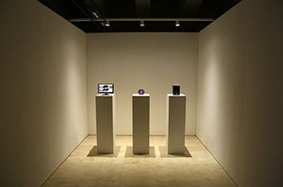 Three plinths sit along a gallery wall. To the right is a speaker, playing audio recording of academic texts, manuals & advertisements. In the middle is a gold archival DVD. On the left a monitor screen shows a video of the same disc in situ, shot on super 8mm.