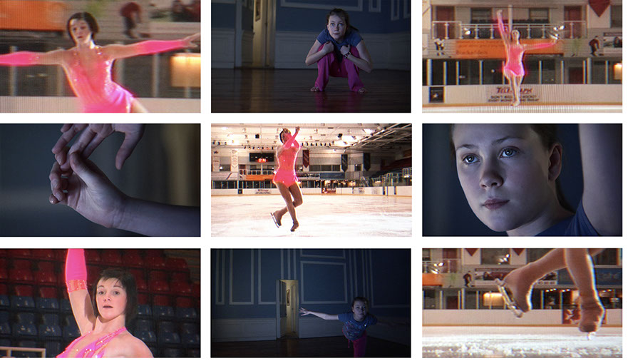 A young girl on the right-hand screen appears to control the movements of a world-class skater, some years older than her, on the left-hand one.